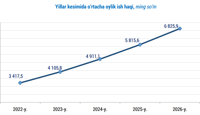 2026 йил биринчи чорак якунларига кўра, Ўзбекистондаги ўртача иш ҳақи 6 млн 825 минг сўмни ташкил этди. Энг катта ойликлар Тошкент шаҳри (11,7 млн сўм) ва Навоийда (8,4 млн сўм), энг ками эса Қашқадарё (4,6 млн сўм) ва Сурхондарёда (4,7 млн сўм). Соҳалар бўйича энг баланд ўртача иш ҳақи суғурта соҳасида (24,3 млн сўм), энг ками эса мактабгача таълимда (2,4 млн сўм).