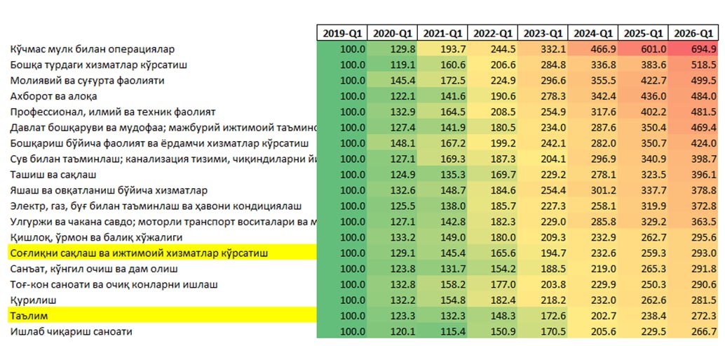 «Таққослаш учун бу даврда соғлиқни сақлаш соҳаси вакилларининг маоши 2,9 баробарга, таълим соҳаси вакилларининг маоши эса 2,7 баробарга ошган. Таъкидлаш керакки, таълим соҳаси вакилларининг маоши фақатгина ишлаб чиқариш саноати вакиллари маошидан юқорироқ ўсган бўлиб қолган барча соҳа вакилларига нисбатан нисбий камбағаллашган», дея ёзади иқтисодчи.