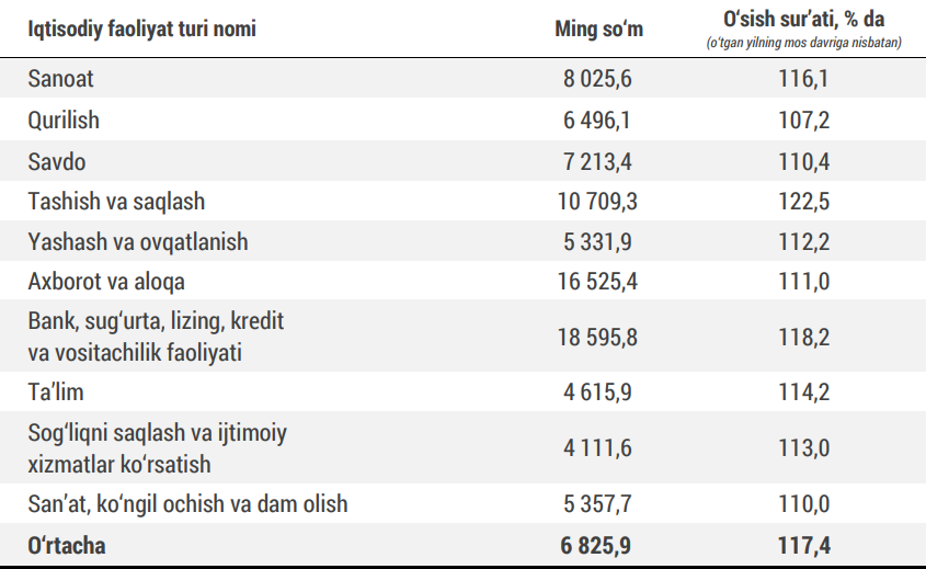 Умуман олганда, тармоқлар кесимида олинса ўртача ойлик иш ҳақи мактабгача таълимда 2 млн 485 минг сўмни, мажбурий ижтимоий суғурталашдан ташқари қайта суғурталаш фаолиятида 24 млн 313 минг сўмни ташкил этган.