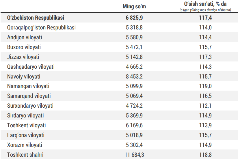 Ойлик маошларнинг энг юқори ўсиши Наманган (+19 фоиз) вилояти, Тошкент шаҳри (+18,8 фоиз) ва Жиззах (+17,3 фоиз) вилоятларида кузатилган.