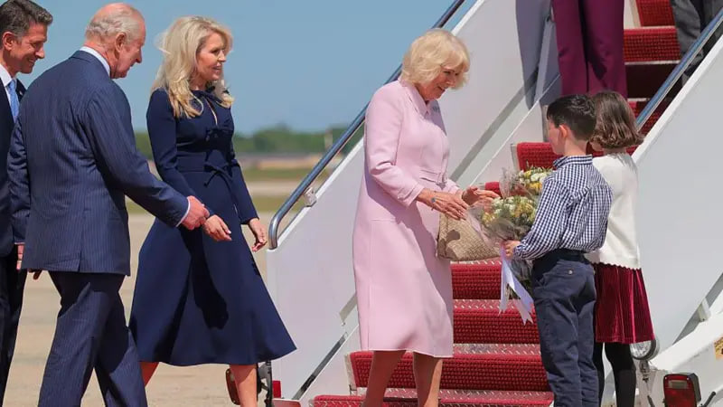 Қирол ва қироличани ҳукумат делегацияси, Буюк Британиянинг АҚШдаги элчиси Кристиан Тёрнер ва Оқ уй протокол бўлими раҳбари Моника Кроули кутиб олди.