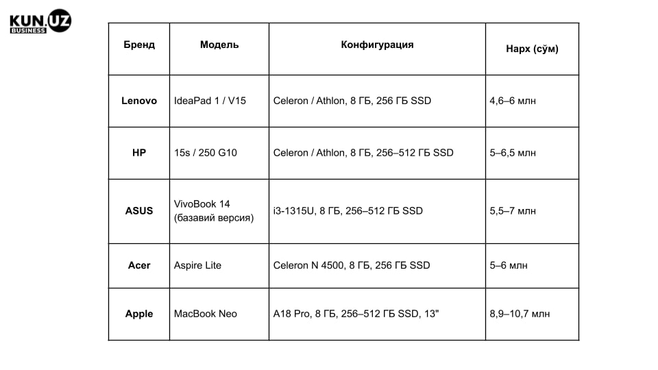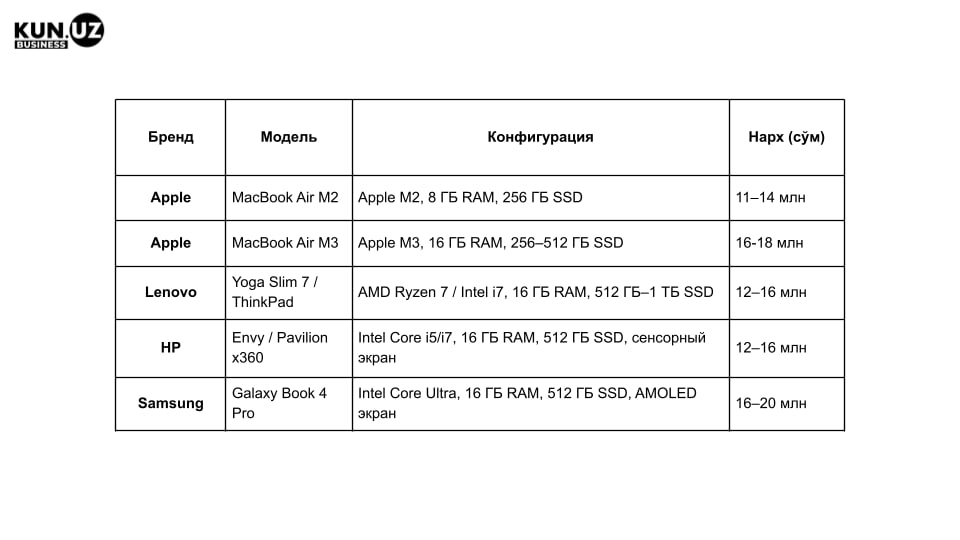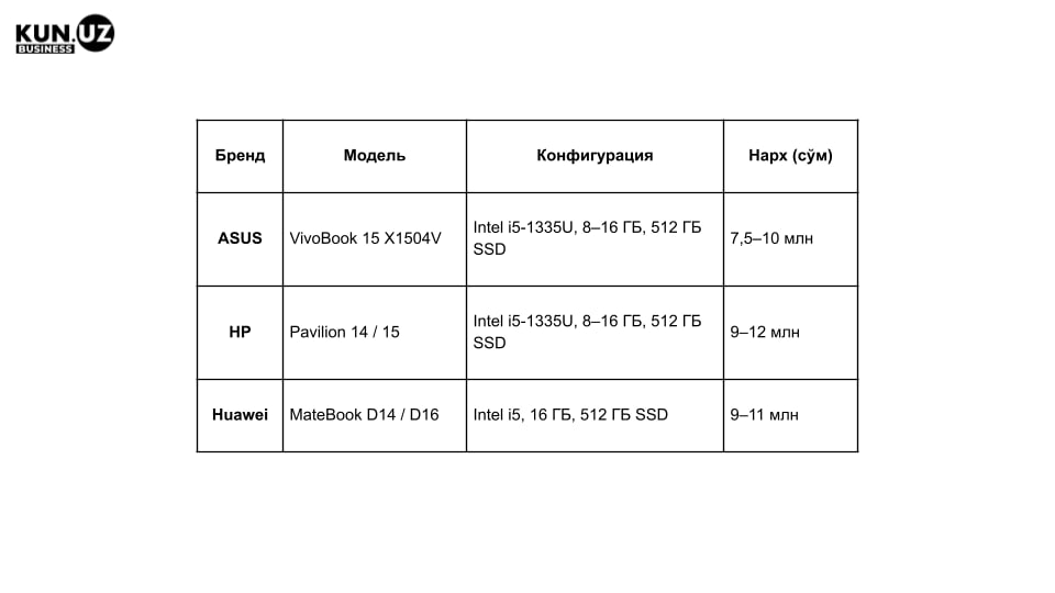 Қуйида ноутбук танлаш мезонлари ва турли бюджетларга мос намунавий моделлар келтирилган.