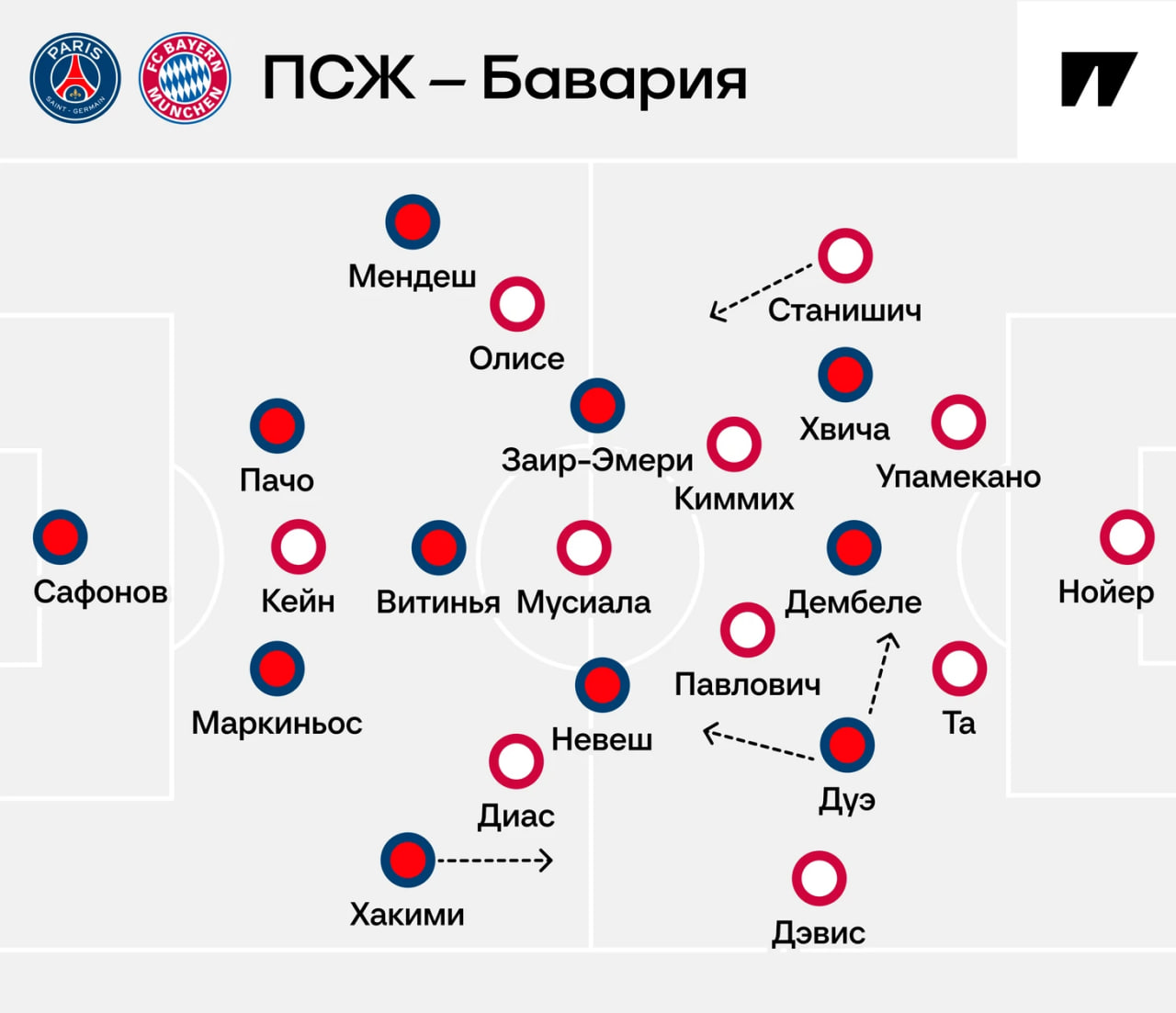 Голлар: Кейн, 17 – пеналти (0:1). Кварацхелия, 24 (1:1). Жоау Невеш, 33 (2:1). Олисе, 41 (2:2). Дембеле, 45+5 – пеналти (3:2). Кварацхелия, 56 (4:2). Дембеле, 58 (5:2). Упамекано, 65 (5:3). Диас, 68 (5:4)