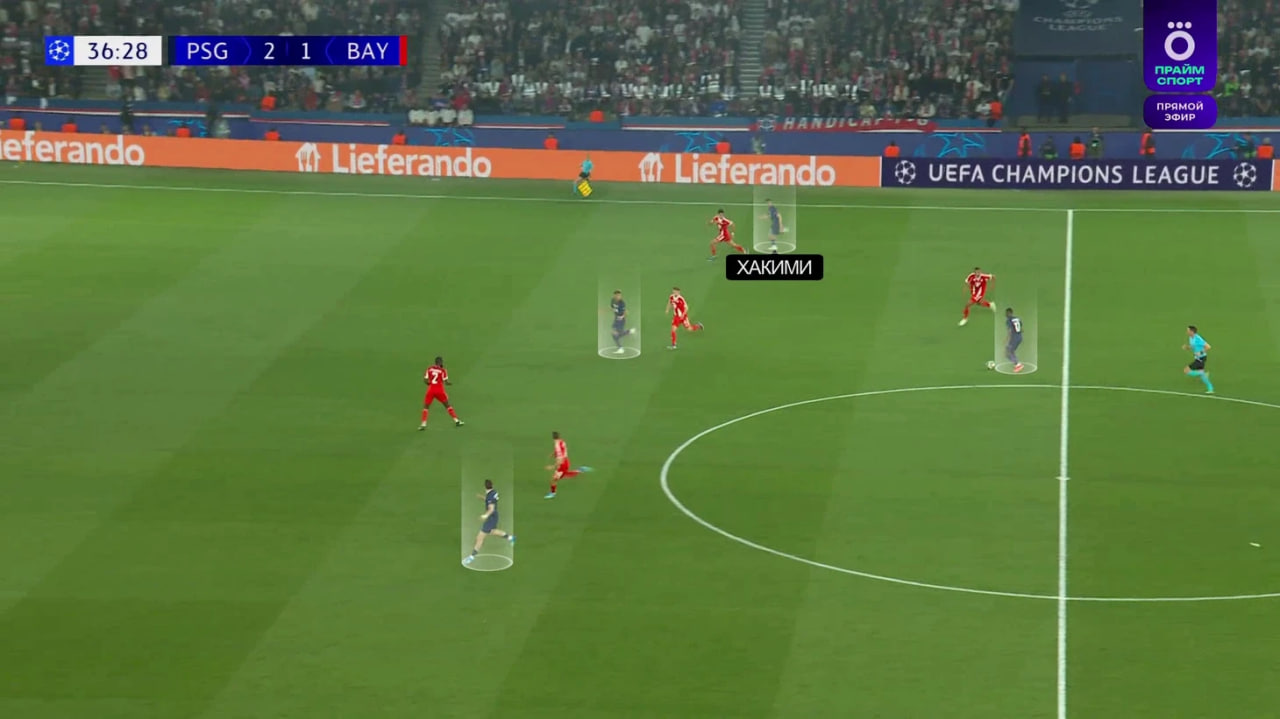 Масалан, «ПСЖ»да қарши ҳужумлардаги стандарт амалиёт – ҳужумкор учлик билан қўшимча футболчи олдинга бориши. Қуйидаги картинада бу вазифада Ашраф Ҳакимини кўриш мумкин.
