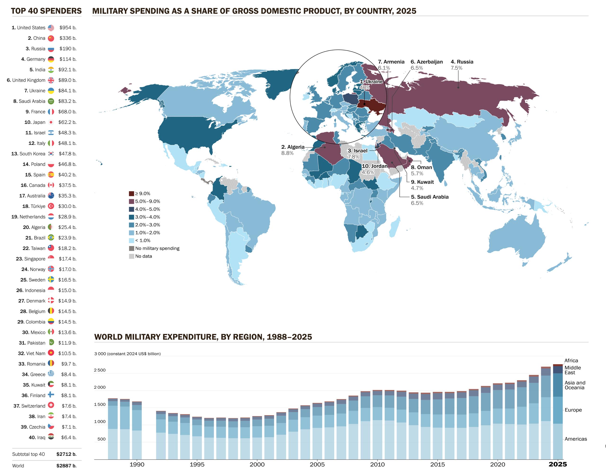Украина дунёдаги Ялпи ички маҳсулотга нисбатан энг йирик ҳарбий харажат қилувчи давлат бўлиб қолмоқда – тахминан 40%. Россия билан тўртинчи йил уруш олиб бораётган Киев дунё миқёсида 7-ўринни эгаллади. Россия эса ўз ЯИМининг 7,5 фоизини ҳарбий мақсадларга сарфлади. Агар уруш давом этса, ҳар икки давлатнинг харажатлари 2026 йилда ҳам ўсиши кутилмоқда.
