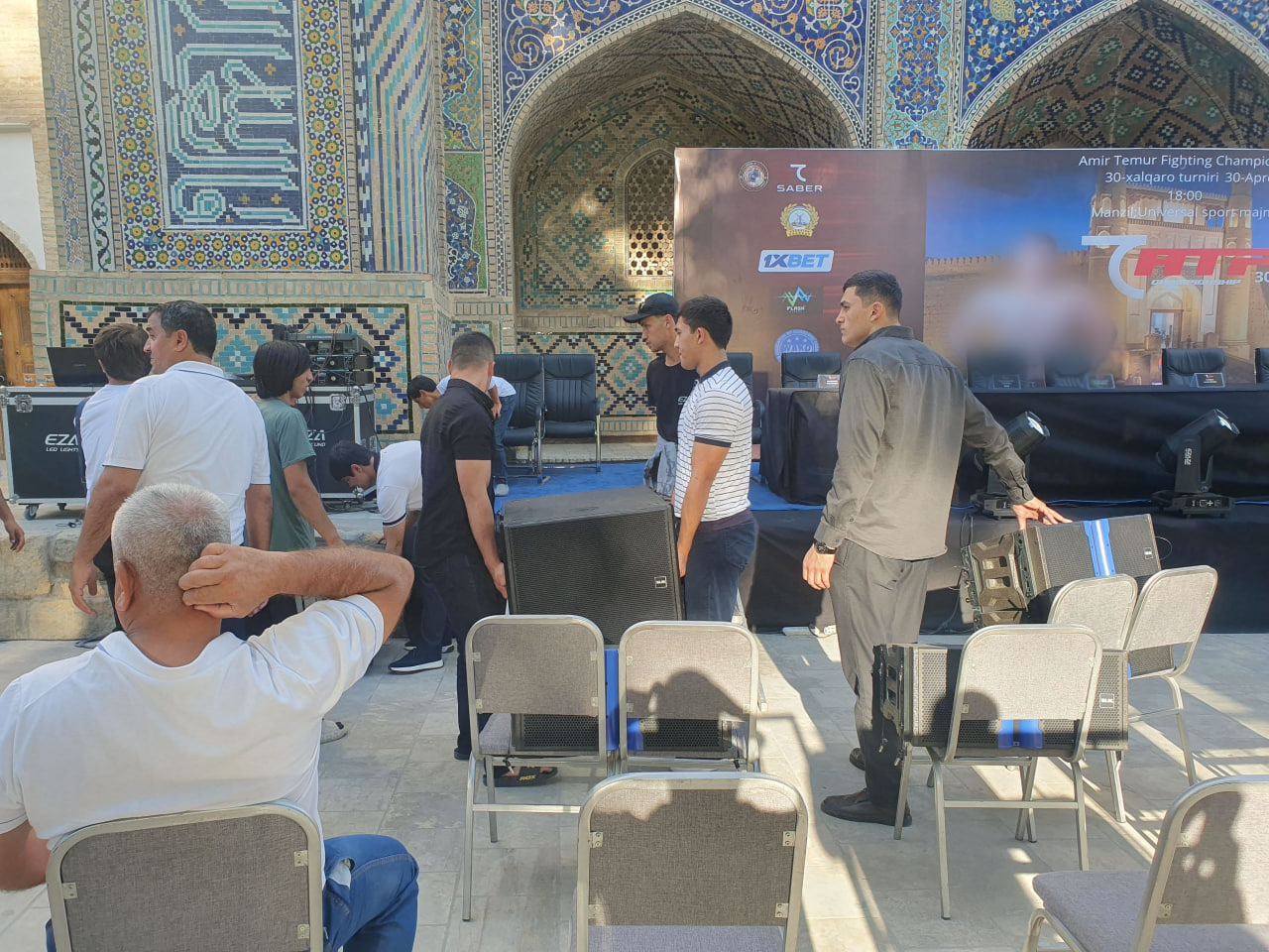Бухородаги тарихий мажмуа олдида ноқонуний тарғибот: ММА турнири баннерида онлайн қимор ўйини логотипи ҳам бор