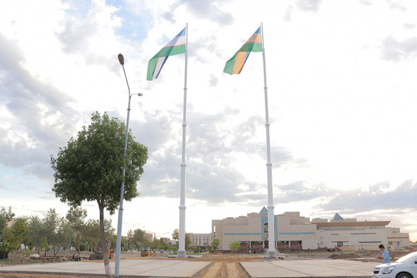 Нукусда 55 метрлик устунларда Ўзбекистон ва Қорақалпоғистон байроқлари ўрнатилди