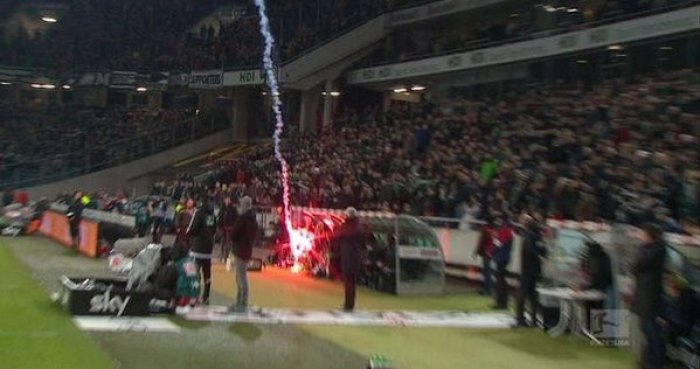 «Вольфсбург» мухлислари ракетницадан учирган мушак «Ганновер» жамоаси захира ўриндиғига келиб тушди