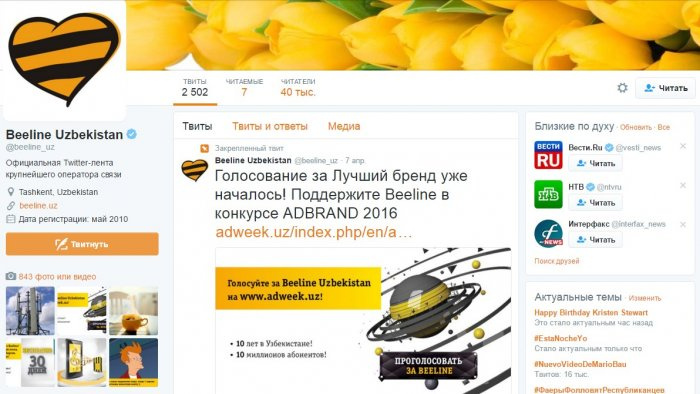 Beeline Uzbekistan мамлакатдаги энг йирик Twitter-бренд бўлиб қолмоқда