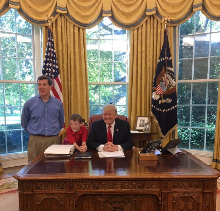 15 sentabrda bolakay Oq uyga taklif qilindi. Bola u yerda bir soatga yaqin o‘t o‘ruvchi mashinada o‘t o‘rdi. Lahzalardan birida uning yoniga Tramp kelib, bolakayni qilgan ishi uchun maqtagan va unga “AQSh kelajagi” ekanligini aytgan. Ta'kidlash joizki, bola qulog‘idagi tiqinlar sababli Trampni darhol payqamagan va ishlashda davom etgan.