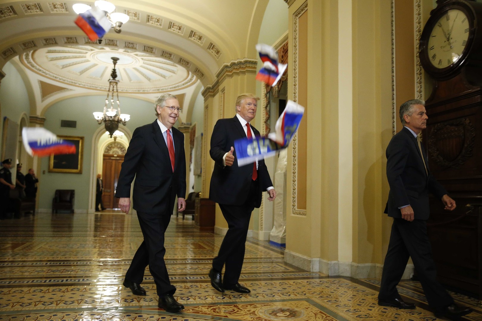 Tramp respublikachilarning senatdagi yetakchisi Mitch Makkonell bilan tushlik qilinadigan xonaga ketayotganda jurnalistlar orasida bo‘lgan erkak u tomon bir quchoq Rossiya bayroqchalarini uloqtirib, "Tramp – xiyonatchi!" deb baqirgan va "Siz nima uchun xiyonat haqida gapirmay, soliq haqida gapirasiz?", deb qo‘shimcha qilgan.