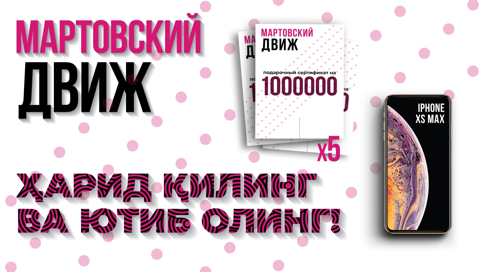 LC Waikiki, Colin's, Jennyfer, Pimkie, Okaidi, Morgan, U.S Polo va boshqa «Martovskiy Dvij» stikerlari bilan belgilangan do‘konlardan 200.000 so‘m miqdorida haridni amalga oshiring va ikkita iPhone XS MAX hamda 10ta 1.000.000 so‘m xajmidagi sertifikatlar taqdim etiluvchi o‘yinda ishtirok eting!