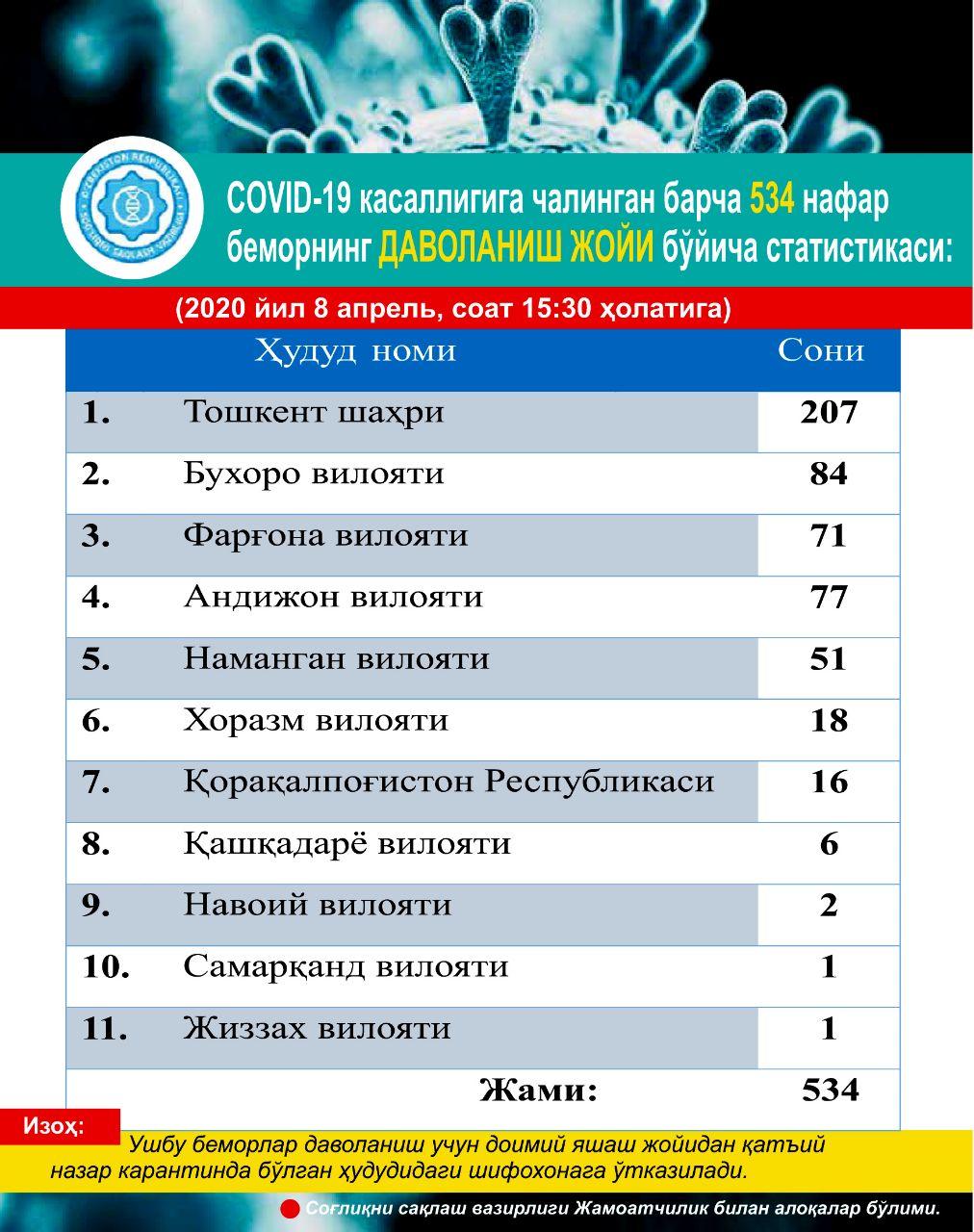 «2020 yil 8 aprel soat 10:00 holatiga ko‘ra, O‘zbekistonda koronavirus infeksiyasi qayd etilganlar soni 534 nafarni tashkil qilmoqda», deyiladi vazirlik xabarida.