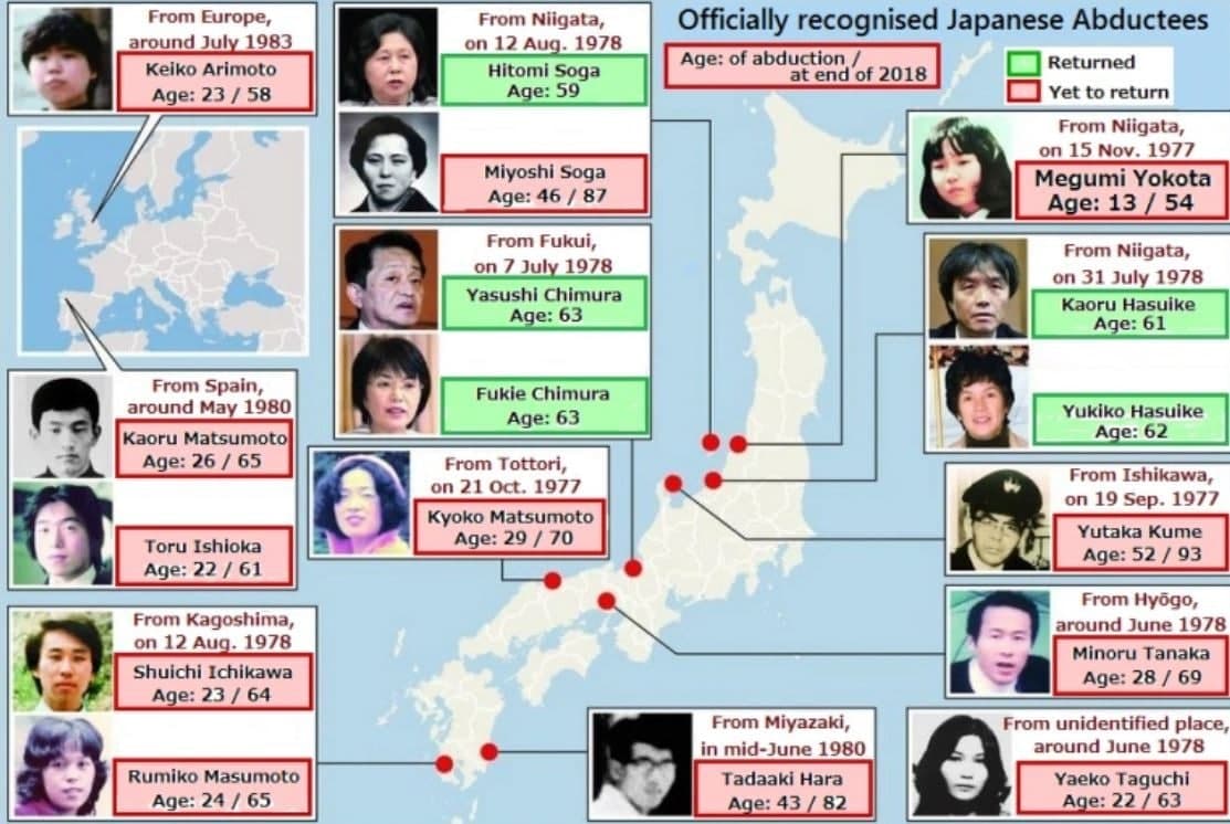O‘g‘irlangan fuqarolar masalasi Yaponiya-Shimoliy Koreya munosabatlaridagi og‘riqli nuqtalardan biri hisoblanadi. Dastlab KXDR rasmiylari yaponlarning o‘g‘irlanishiga aloqador shaxslar jazoga tortilishi haqida aytgan bo‘lsa-da, amalda bu talab bajarilmaydi.