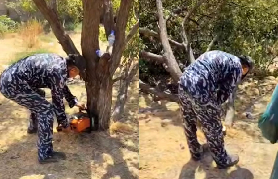 Unda benzopila ko‘targan ishchi mahalliy aholi vakilining qarshilik ko‘rsatishiga qaramay, mas’ullar nazorati ostida ko‘p qavatli turar joylar atrofidagi yosh va sog‘lom daraxtlarni tag-tugi bilan kesib tashlayotganini ko‘rish mumkin.