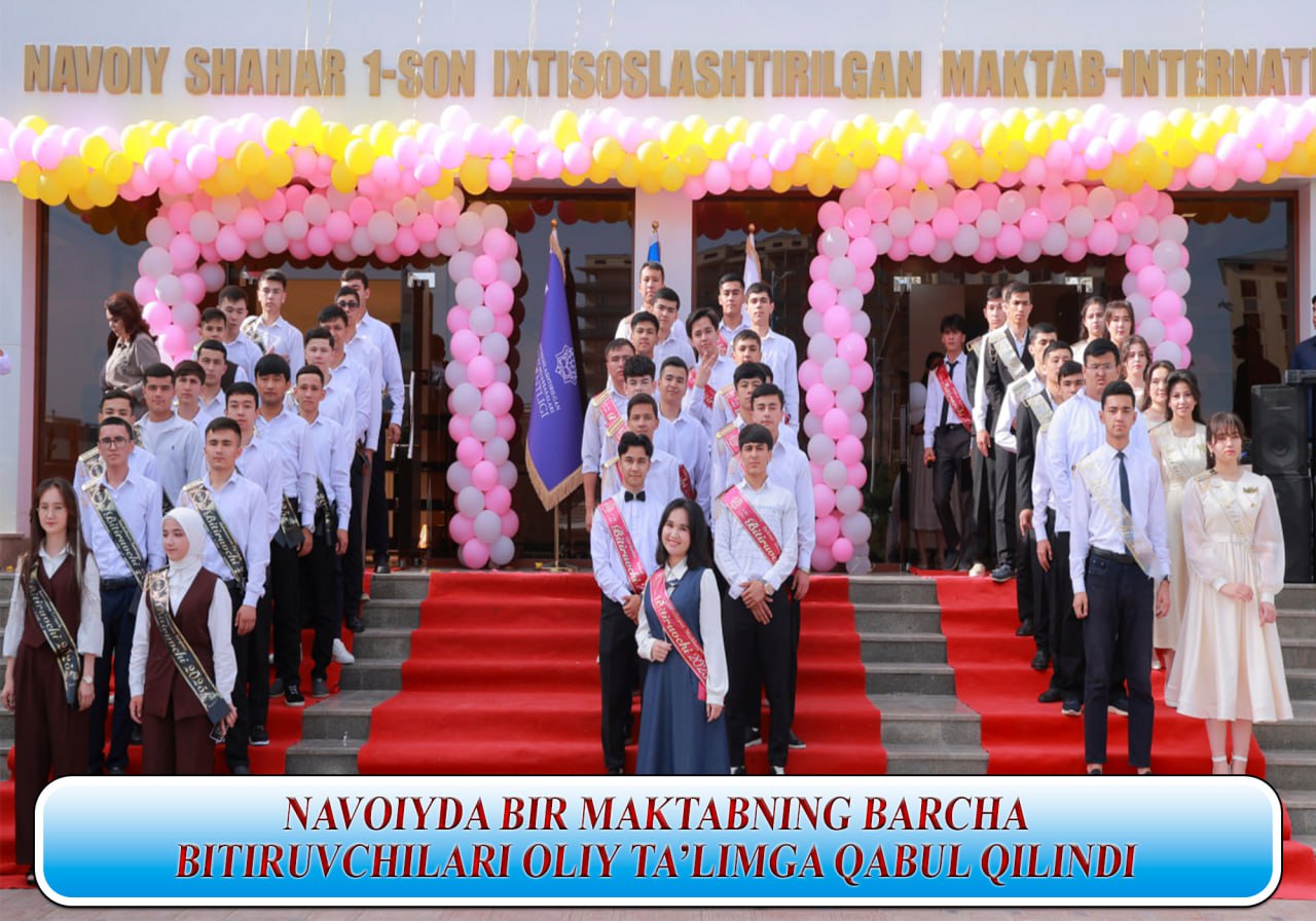 Navoiy shahridagi 1-son ixtisoslashtirilgan maktab-internati bitiruvchilari OTMga o‘qishga kirishda 100 foizlik natijani qayd etdi: maktabni tamomlagan 60 nafar bitiruvchining barchasi davlat oliy ta’lim muassasalariga qabul qilingan.