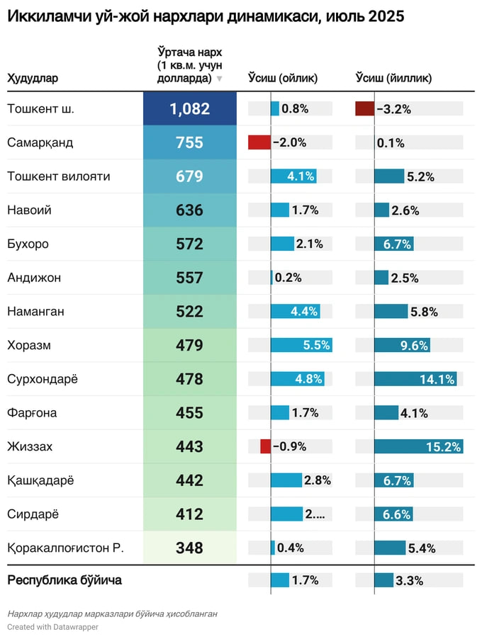 Hududlar kesimida 2024 yilning iyul oyidan buyon uy-joy narxlarida eng katta o‘sish Jizzax (15,2 foiz), Surxondaryo (14,1 foiz) va Xorazm (9,6 foiz) viloyatlarida kuzatilgan.