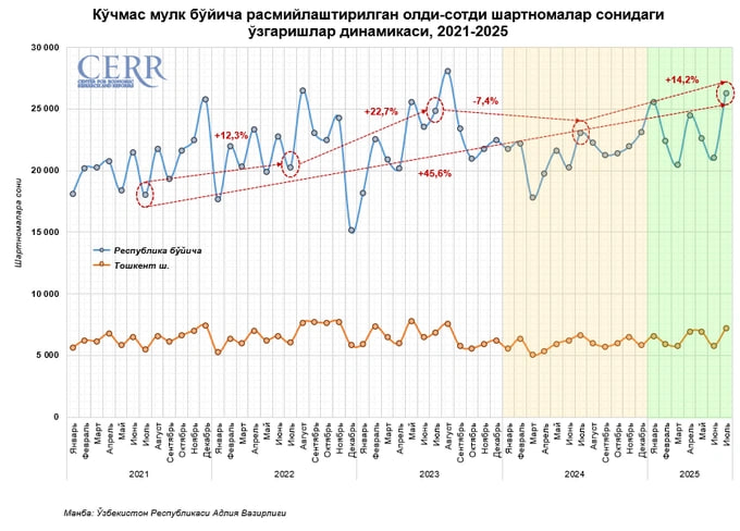 Qayd etilishicha, bu so‘nggi davrlardagi eng yirik oylik o‘sish ko‘rsatkichlaridan biri hisoblanadi. Iyul oyida O‘zbekistonning barcha hududlari uy-joy bozorida faollik oshgan. Eng sezilarli o‘sish Surxondaryo (41 foiz), Sirdaryo (35,3 foiz) va Qashqadaryo (33,7 foiz) viloyatlarida kuzatilgan. Toshkent shahrida esa uy-joy bozori faolligi 24,6 foizga o‘sgan.