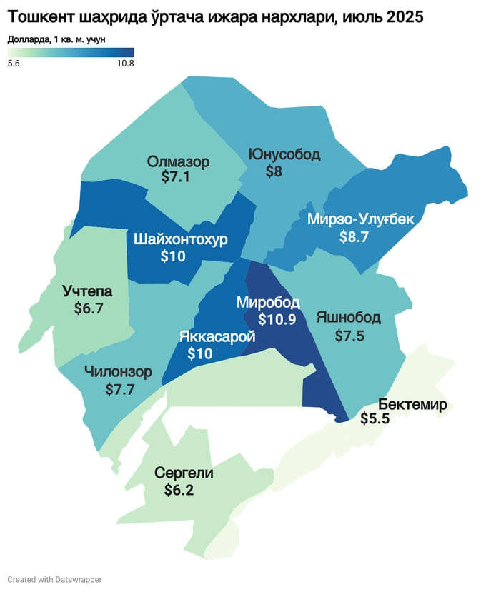 Poytaxtning Mirobod, Shayxontohur va Yakkasaroy tumanlarida ijara narxi nisbatan yuqoriligicha qolmoqda. Ushbu tumanlarda bir kvadrat metr uchun o‘rtacha 10,3 dollar.