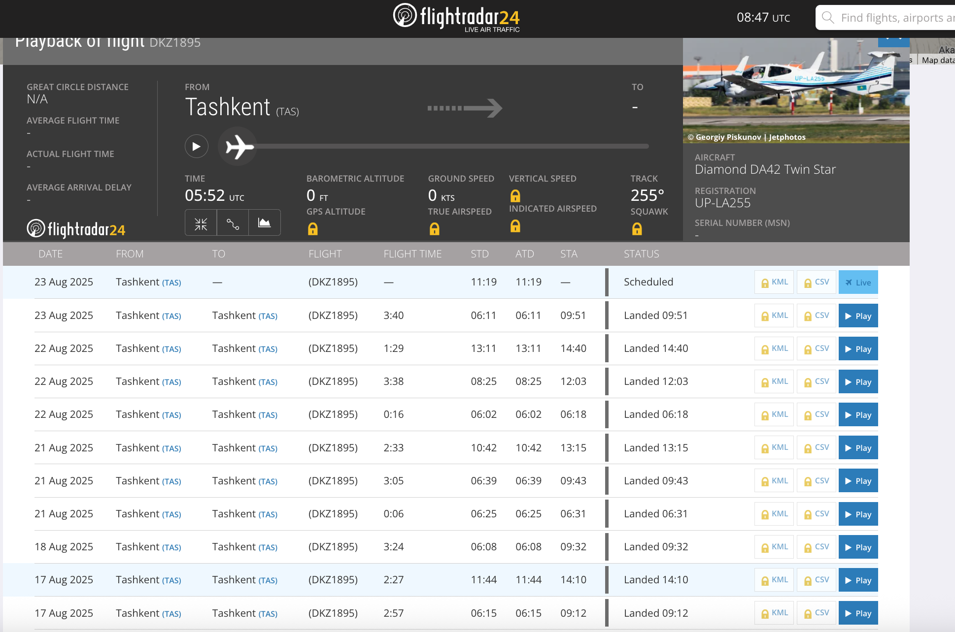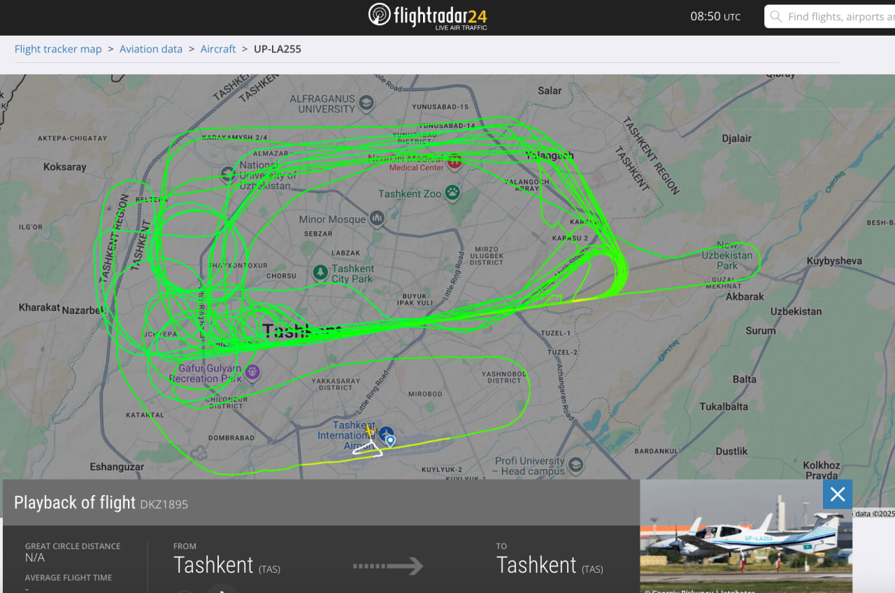 Dala Air kompaniyasining Diamond DA42 samolyoti Toshkent Sharqiy aeroporti uchish-qo‘nish yo‘lagi navigatsiya tizimini sozlash bilan shug‘ullanmoqda. Flightradar 24 ma’lumotlariga ko‘ra, samolyot 17 avgustdan buyon har kuni bir necha soatlik parvozni amalga oshirgan.