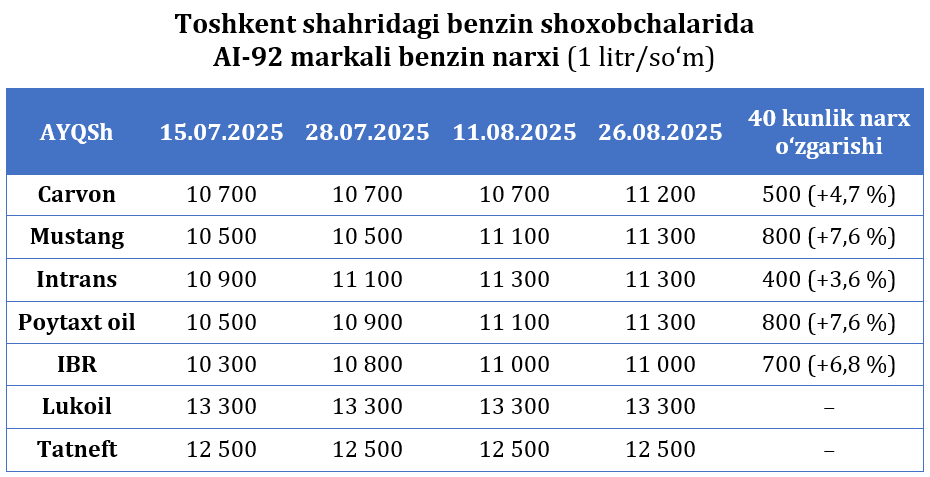 Oxirgi haftalarda AYoQShlarda AI-92 benzini sezilarli qimmatlashdi. Narxlar iyul oyining o‘rtalaridan keyin 7,6 foizgacha oshgan. Shu bilan bir paytda AI-80 narxi ham ko‘tarilgan.