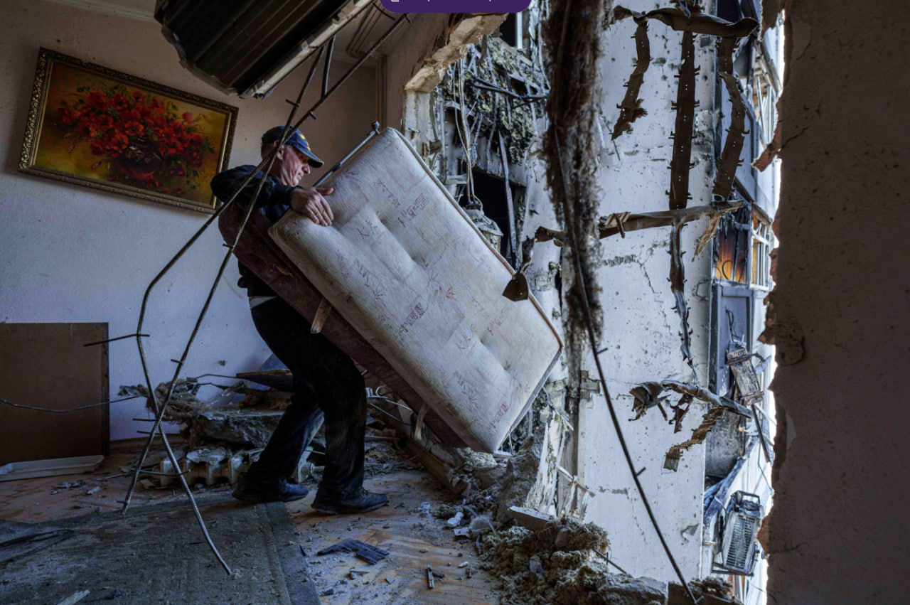 Kiyevlik kishi Rossiya zarbasi oqibatida zarar ko‘rgan kvartirasidan butun qolgan buyumlarini olib chiqmoqda