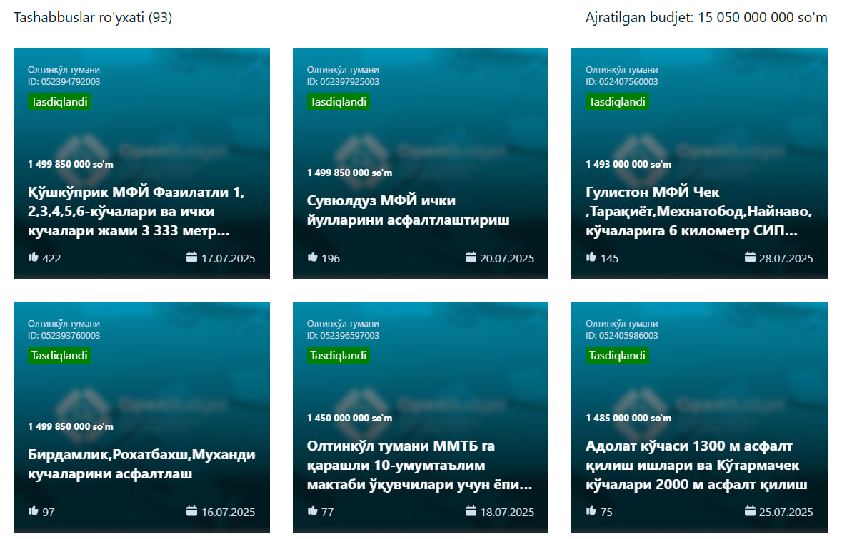 Ma’lumot uchun, ushbu tumanda fuqarolar tomonidan jami 116 ta loyiha kelib tushgan bo‘lib, bundan avvalgi mojaroli holatda ulardan atigi 22 tasi ovoz berishga o‘tkazilgan, 94 ta loyiha asoslantirilmagan holda rad etilgan edi.