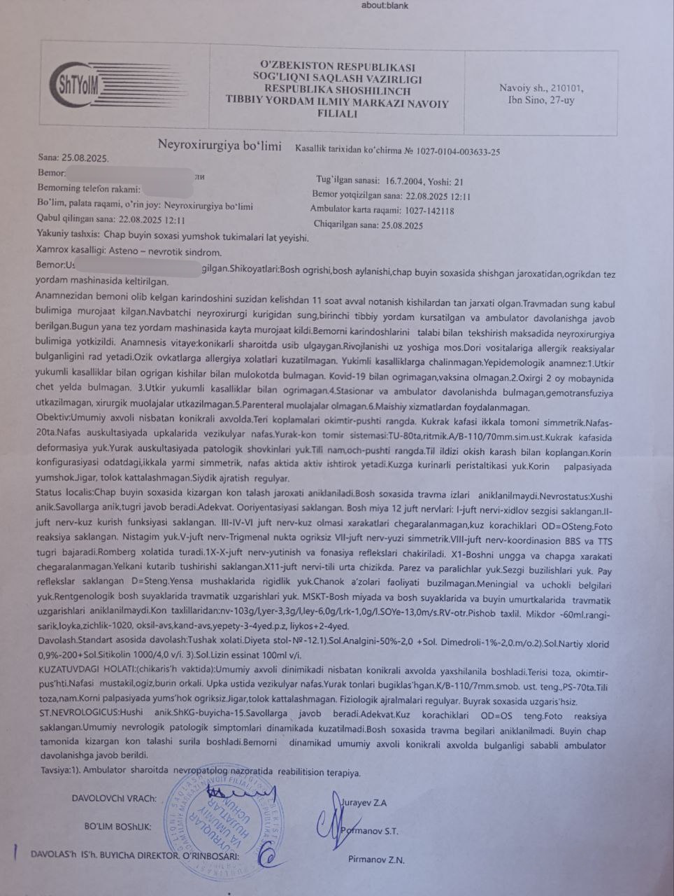 Mehmonxonada birga ishlaydigan yigitlar tez yordamga xabar berishgan. Tez yordan kelgunicha urgan shaxslar qochib ketgan. M.U.ning esa ahvoli og‘irlashgan. Hasan ismli hamkasbi Respublika shoshilinch tibbiy yordam ilmiy markazi Navoiy filialiga olib borgan. Navbatchi shifokor 1-2 ta dori-darmon qilib, jo‘natib yuborgan. Ertasi kuni yana ahvoli og‘irlashgan va ota-onasi qayta Respublika shoshilinch tibbiy yordam ilmiy markazi Navoiy filialiga olib borgan. U yerda neyroxirurg ko‘rib, IIBga xabar bergan. Bu orada urgan yigitning sherigi, ya’ni sportchi kelib, shifokor bilan gaplashib ketgan. M.U. dushanba kuni “Bo‘yin yumshoq to‘qimalari lat yeyishi. Asteno-nevrotik sindrom” tashxisi bilan chiqarib yuborilgan. Juma kuni yana qayta kasalxonaga yotqizildi. Bosh miyasini MRT qilib, tekshirib ko‘rdik, unda yaqqol bosh miya chayqalish holati bor edi”, deydi M.U.ning qarindoshlaridan biri.