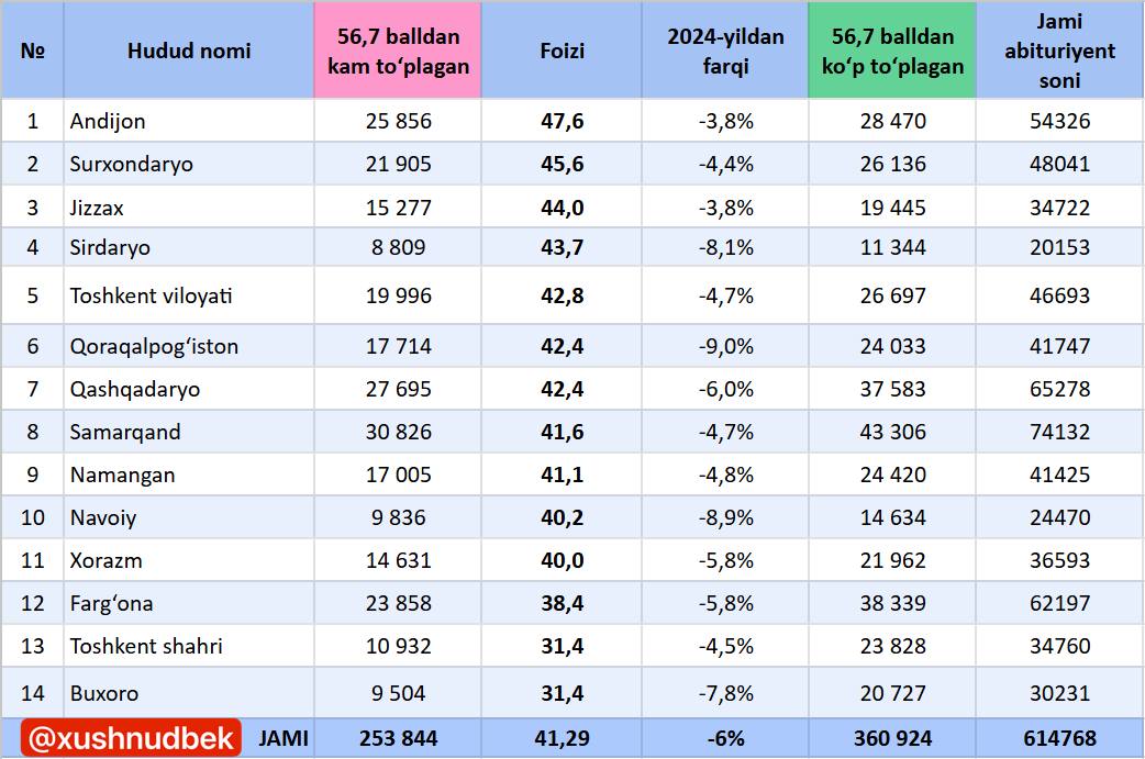 2023 yilda 8 ta, 2024 yilda esa 4 ta hududda abituriyentlarning 50 foizdan ko‘prog‘i 56,7 balldan past ball olgan. Joriy yilda bironta hududda bunday salbiy ko‘rsatkich qayd etilmagan.