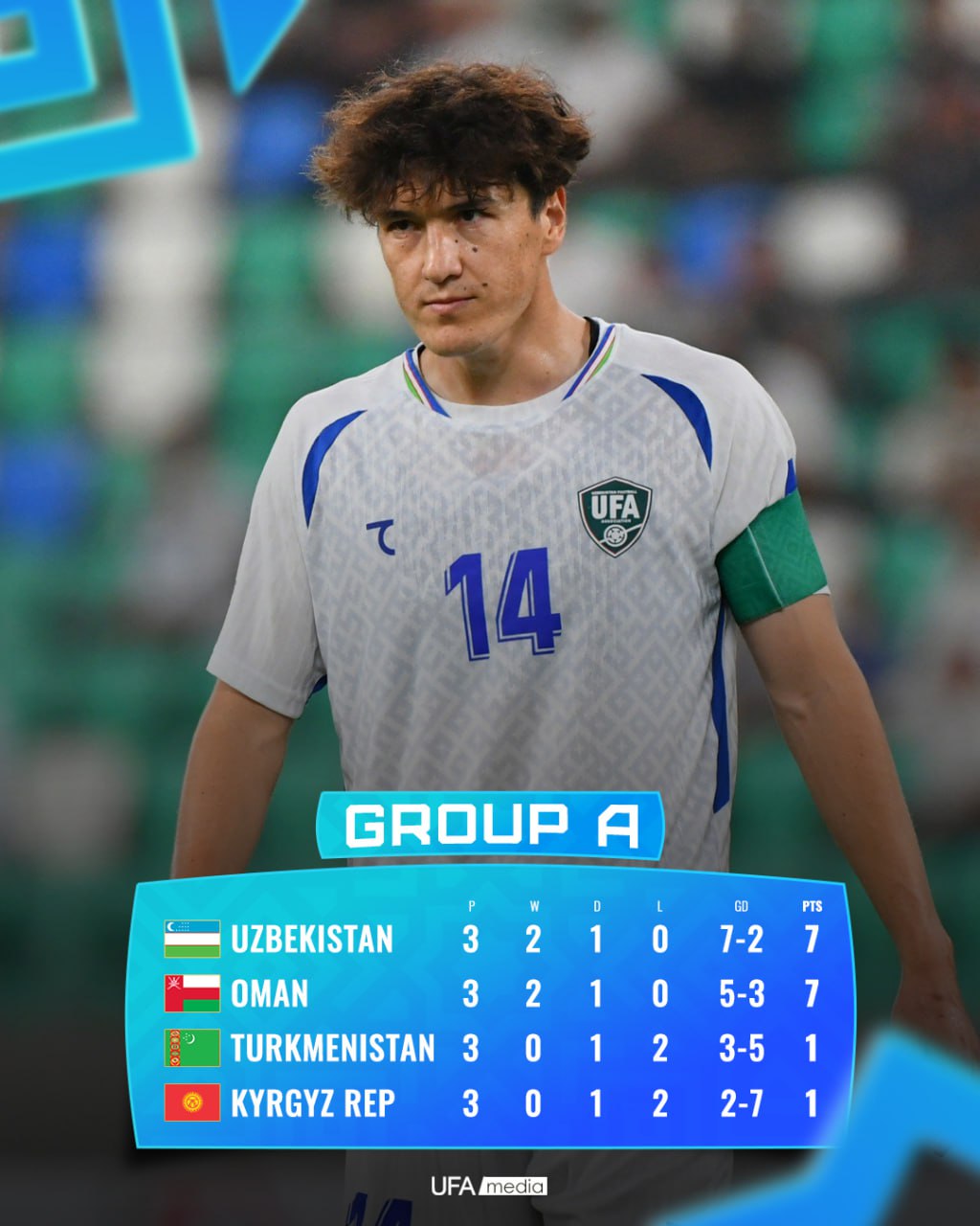 O‘zbekistonliklar raqib darvozasini to‘rt marta ishg‘ol qildi va guruhda birinchi o‘rinni egalladi. Final 8 sentabr kuni Toshkentda, Eron milliy jamoasiga qarshi o‘tkaziladi.