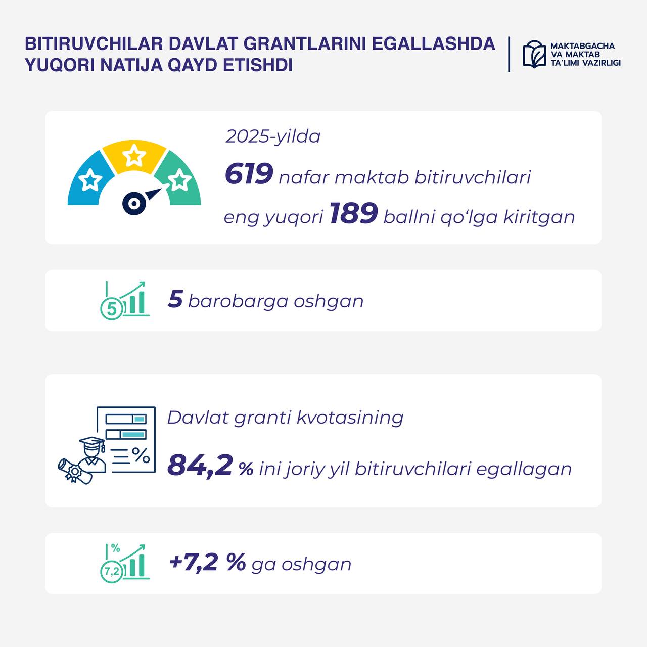 Shuningdek, 2025 yilda 619 nafar bitiruvchi test sinovlarida eng yuqori 189 ballni to‘play olgan. Bu o‘tgan yilga qaraganda 5 barobarga ko‘p. Davlat granti kvotasining 84,2 foizini (29 881 nafar) joriy yil bitiruvchilari egallagan.