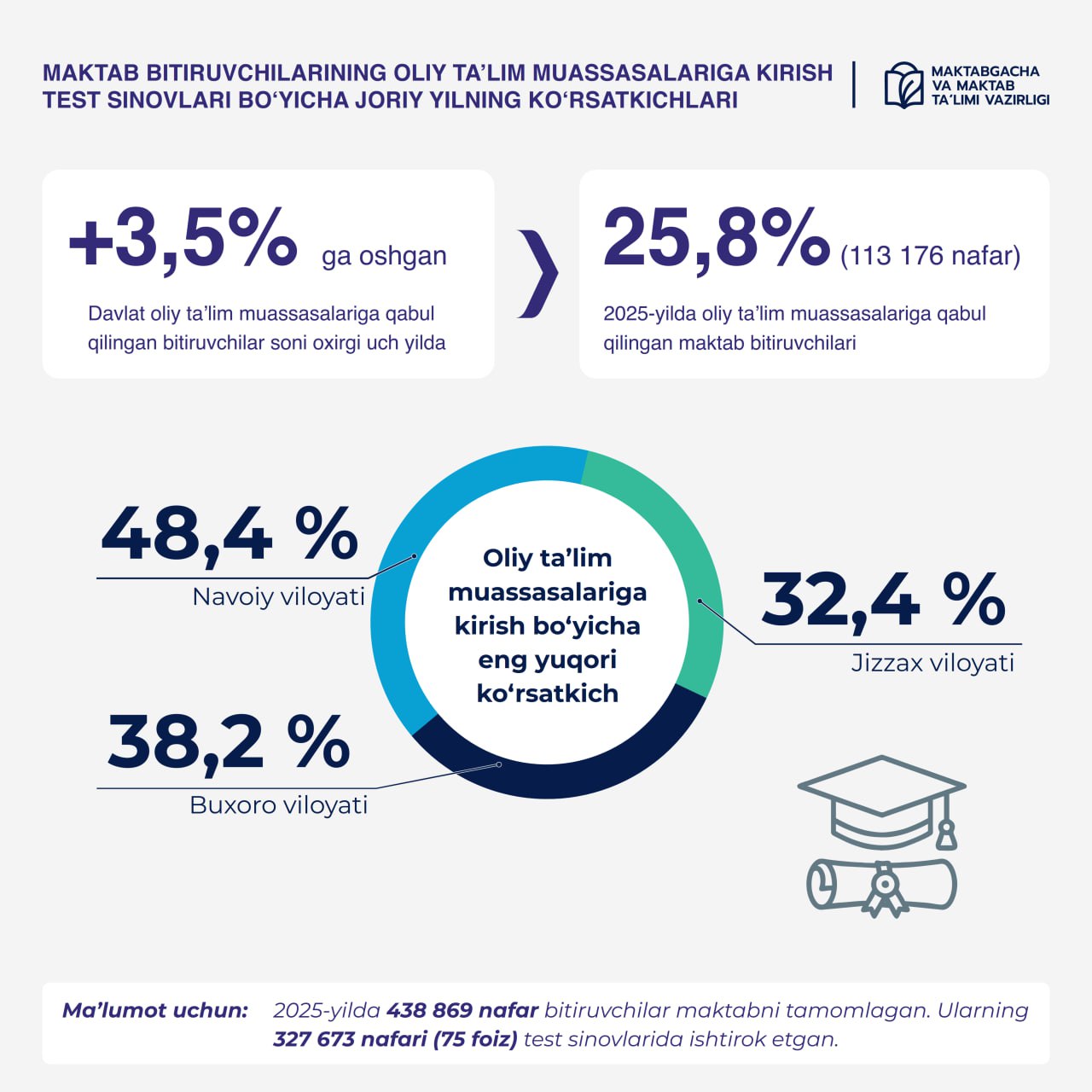 Ma’lum qilinishicha, 2025 yilda respublikada 438 869 nafar o‘quvchi maktabni bitirgan. Ularning 327 673 nafari test sinovlarida ishtirok etgan. Shundan 113 176 nafari, ya’ni 25,8 foizi talabaga aylangan. Bu ko‘rsatkich o‘tgan yilga nisbatan 3,5 foizga oshgan.