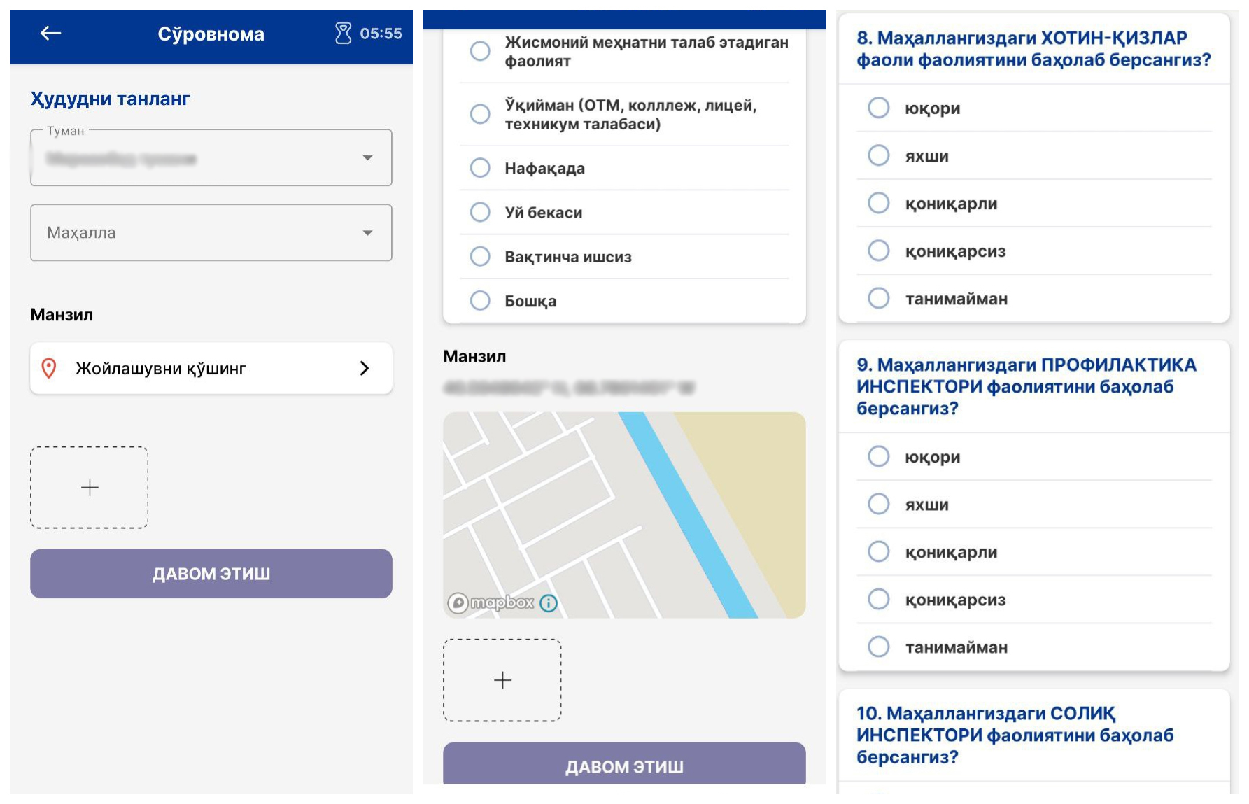 Tibbiyot xodimlariga o‘zi ishlaydigan hududda joylashgan har bir mahalladan eng kamida 10 kishi bilan suhbatlashib, ijtimoiy so‘rovnoma savollarini to‘ldirib chiqishlari buyurilgan. Kun.uz manbasining ma’lum qilishicha, har bir so‘rovnoma oralig‘i 6-10 daqiqa orasida bo‘lishi zarurligi, agar interval yaqin bo‘lsa, dastur javoblarni qabul qilmasligi aytilgan.