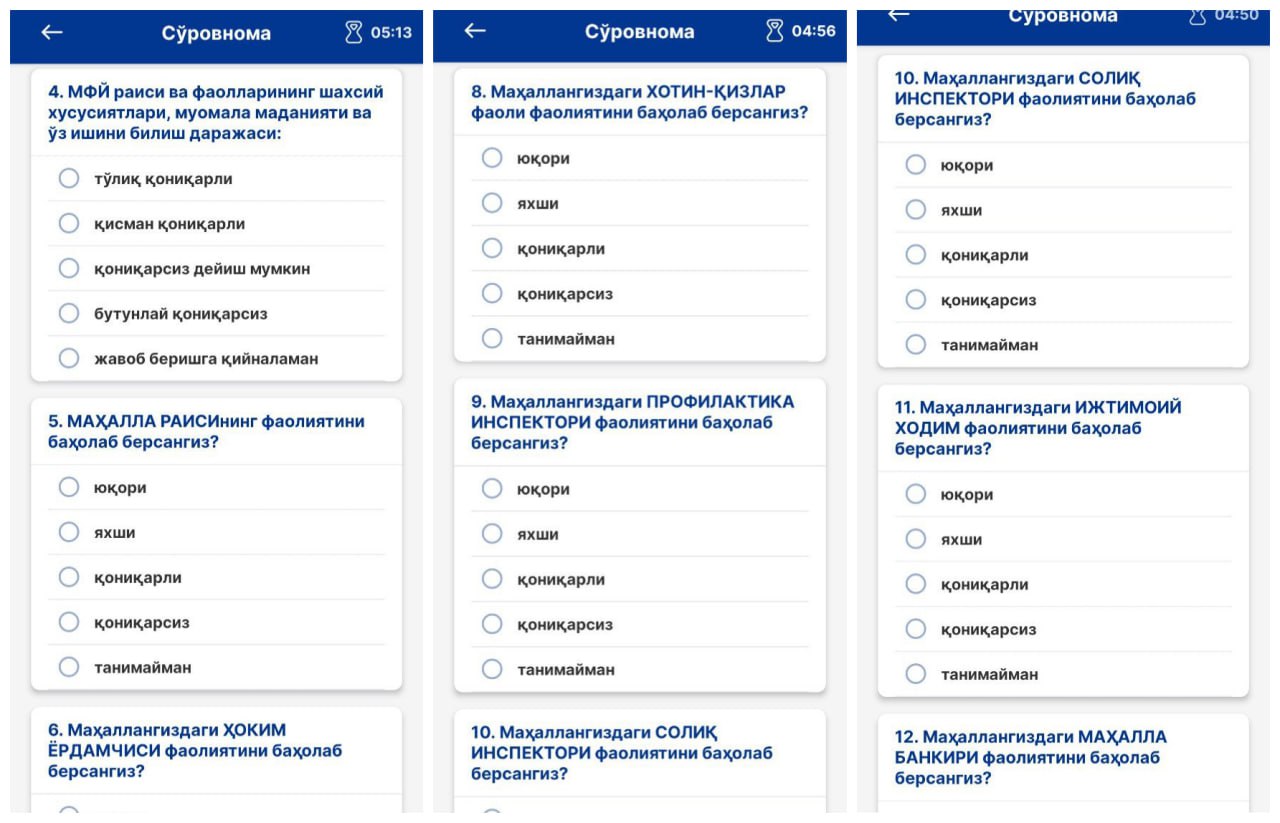 Kun.uz ushbu so‘rovnoma bilan tanishdi. U jami 21 ta savoldan iborat. Mobil ilovaga infratuzilma holati (ichki yo‘llar, suv ta’minoti, kommunal xizmat, chiqindi tashish xizmati), mahallaga xizmat ko‘rsatuvchi tashkilotlar (hokimiyat, ta’lim, sog‘liqni saqlash, bandlik muassasalari), aholi bilan muloqot va murojaatlar ijrosi, MFY raisi, hokim yordamchisi, yoshlar yetakchisi, profilaktika inspektori, xotin-qizlar faoli, soliq inspektori, ijtimoiy xodim, mahalla bankiri faoliyati, sayyor qabullar va murojaatlar ijrosi kabi yo‘nalishlar bo‘yicha savollar kiritilgan.