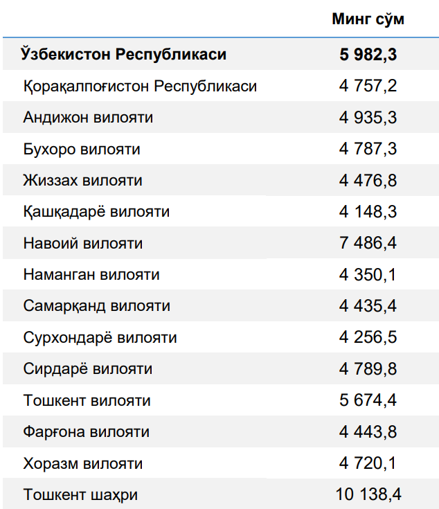 1 iyul holatiga ko‘ra, o‘rtacha oylik ish haqining eng yuqori miqdori Toshkent shahri (10 mln 138 ming), Navoiy (7 mln 486 ming) va Toshkent viloyatida (5 mln 674 ming), eng kam miqdori esa Qashqadaryo (4 mln 148 ming), Surxondaryo (4 mln 256 ming) va Namangan (4 mln 350 ming) viloyatlarida qayd etilgan.