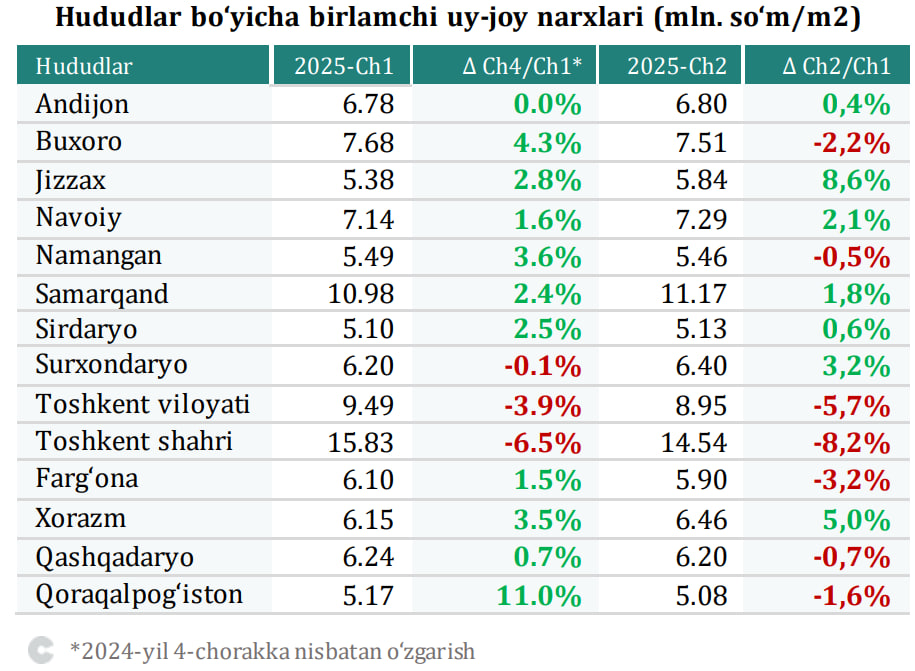 2025 yil II chorak yakunlariga ko‘ra, hududlar kesimida birlamchi bozordagi uy-joy narxlarining eng baland qiymati Toshkent shahri (1 kv metr uchun 14 mln 540 ming so‘m), Samarqand (11 mln 170 ming so‘m) va Toshkent (8 mln 950 ming so‘m) viloyatlarida, eng past narxlar esa Qoraqalpog‘iston Respublikasi (5 mln 80 ming so‘m), Sirdaryo (5 mln 130 ming so‘m) va Namangan (5 mln 460 ming so‘m) viloyatlarida qayd etilgan.