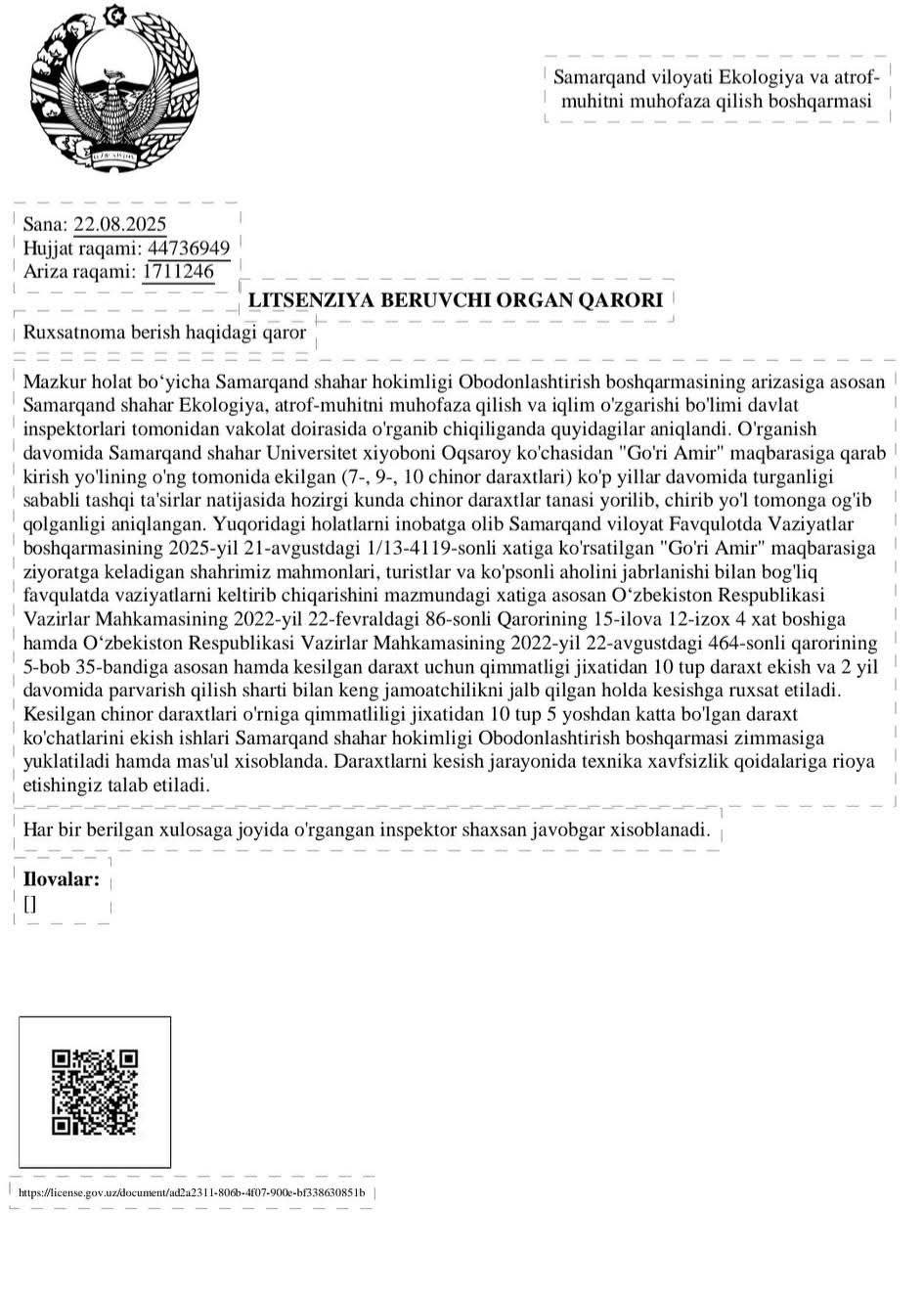 Boshqarmaning ma’lumot berishicha, chinorlarni kesish uchun belgilangan tartibda litsenziya ham olingan. 22 avgust kuni chiqarilgan ruxsatnoma asosida Samarqand shahar hokimligi Obodonlashtirish boshqarmasi arizasi va Favqulodda vaziyatlar boshqarmasi xatiga tayanilgan holda ushbu qaror qabul qilingan.
