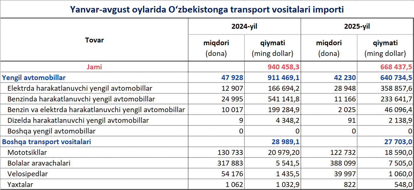 2025 yilning dastlabki 8 oyida jami 42 230 ta yengil avtomobil olib kirilgan bo‘lib, bu – o‘tgan yilning mos davri (47 928 ta)ga nisbatan 11,9 foizga kam.