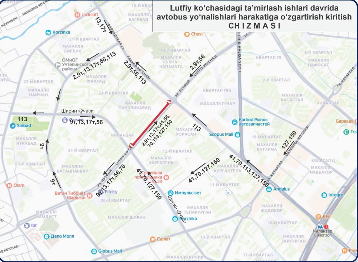 Lutfiy ko‘chasining Farhod ko‘chasidan Shirin ota ko‘chasigacha bo‘lgan qismidagi qurilish ishlari munosabati bilan avtobus yo‘nalishlariga vaqtincha o‘zgartirishlar kiritildi.