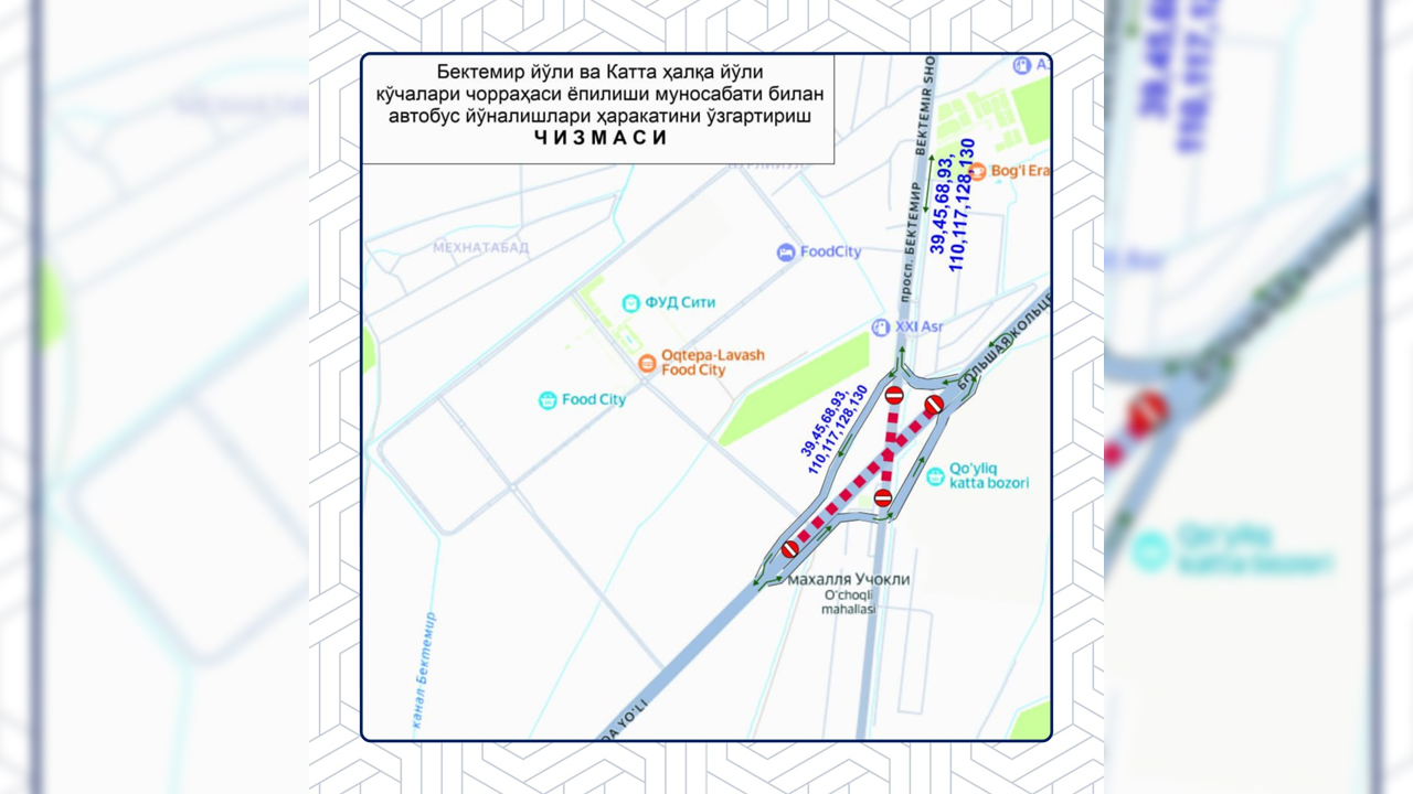 21 sentabrdan boshlab Bektemir tumanidagi Bektemir yo‘li va Katta halqa yo‘li ko‘chalari chorrahasida yo‘l inshooti qurilish ishlari olib borilayotgani sababli mazkur chorraha vaqtincha yopildi.
