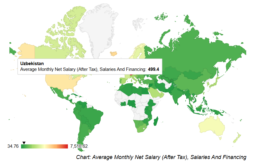 Numbeo ma’lumotlar bazasi 127 ta mamlakatning har oylik sof ish haqi bo‘yicha ham bir qancha raqamlarni keltirgan. Unga ko‘ra, soliqlarni hisobga olmaganda O‘zbekiston fuqarolari har oy o‘rtacha 499 dollar maosh oladi.