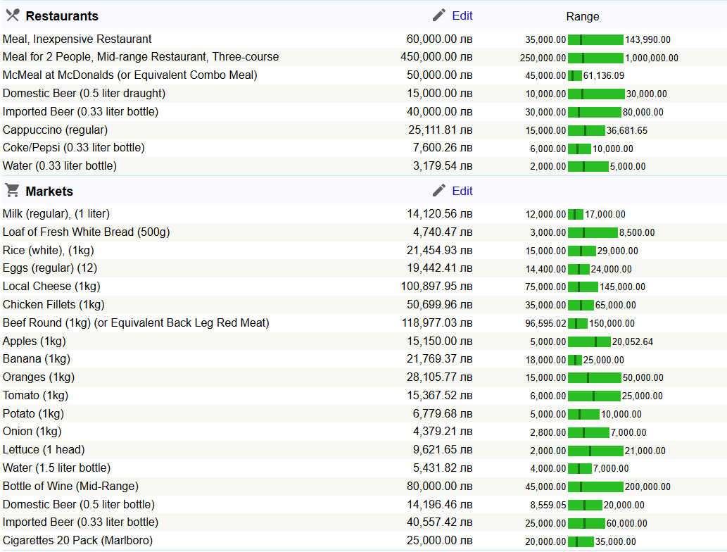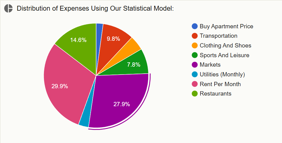 Numbeo ma’lumotlariga ko‘ra, xarajatlarning 27,9 foizi do‘konlardan turli mahsulotlarni sotib olish, 29,9 foizi har oylik ijara, 14,6 foizi restoranlarda ovqatlanish, 9,8 foizi transport, 7,8 foizi esa sport va bo‘sh vaqtdagi mashg‘ulotlar uchun sarflanadi.