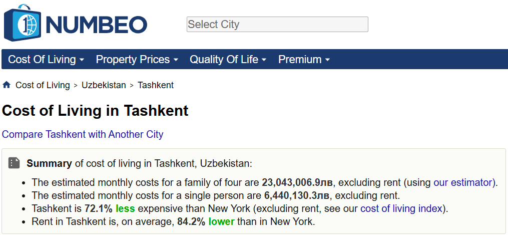 Dunyoning eng yirik onlayn ma’lumotlar bazasidan biri – Numbeo Toshkentda qancha mablag‘ evaziga farovon yashash mumkinligini ma’lum qildi. Onlayn bazaning taxminiy hisoblashlariga ko‘ra, poytaxtda 4 kishi bo‘lib yashaydigan oilalar ijara to‘lamasdan oyiga 23 mln 43 ming so‘m sarflab yaxshi yashashi mumkin. Bir kishi uchun bu narx 6 mln 440 ming so‘mni tashkil etadi.