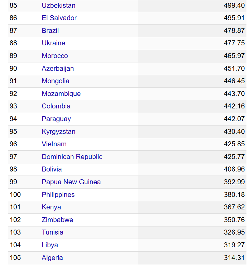 Shunga muvofiq, O‘zbekiston 127 ta mamlakat ichida 85-o‘rinni egallab turibdi.