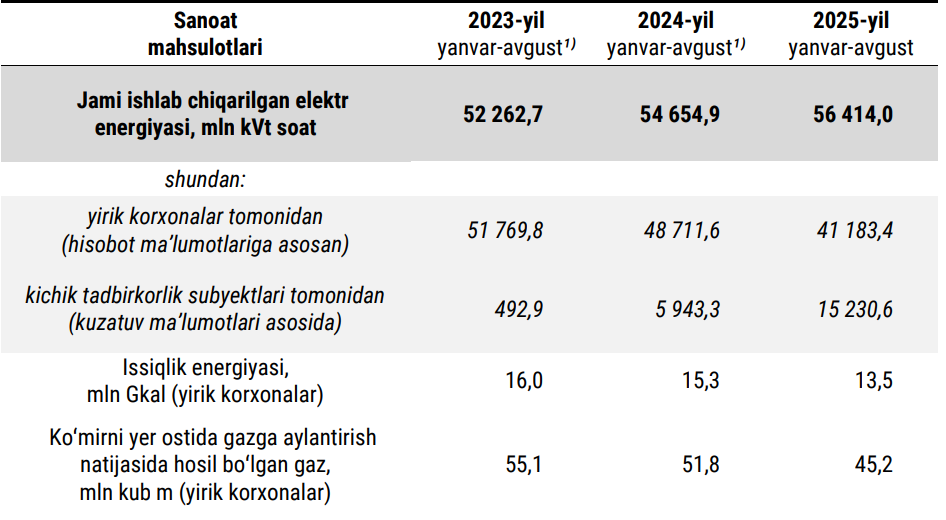 Elektr energiyasi ishlab chiqarish umumiy hisobda oshgan. Xususan, 2024 yilning yanvar-avgust oylarida 54,65 mrld kWh elektr energiyasi ishlab chiqarilgan bo‘lsa, bu ko‘rsatkich joriy yilning mos davrida 56,41 mlrd kWh’ni tashkil etgan. Bunda yirik korxonalar tomonidan ishlab chiqariladigan elektr energiya hajmi 15,5 foizga kamaygan bo‘lsa, kichik tadbirkorlik sub’yektlari tomonidan ishlab chiqarilgan elektr energiyasi hajmi 2,5 barobarga oshgan.