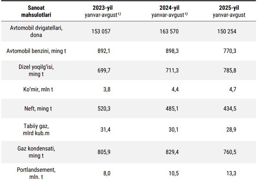 Joriy yilning yanvar-avgust oylarida O‘zbekistonda gaz qazib olish 4 foizga, neft qazib olish 10 foizga, benzin ishlab chiqarish 14 foizga qisqargan bo‘lsa, dizel yonilg‘isi ishlab chiqarish 10 foizga oshdi. Shuningdek, elektr energiyasi ishlab chiqarish ham ko‘paygan. Bunda yirik korxonalar tomonidan ishlab chiqariladigan elektr energiyasi hajmi 15,5 foizga kamaygan bo‘lsa, kichik tadbirkorlik sub’yektlari tomonidan ishlab chiqarilgan elektr energiyasi hajmi 2,5 barobarga oshgan.