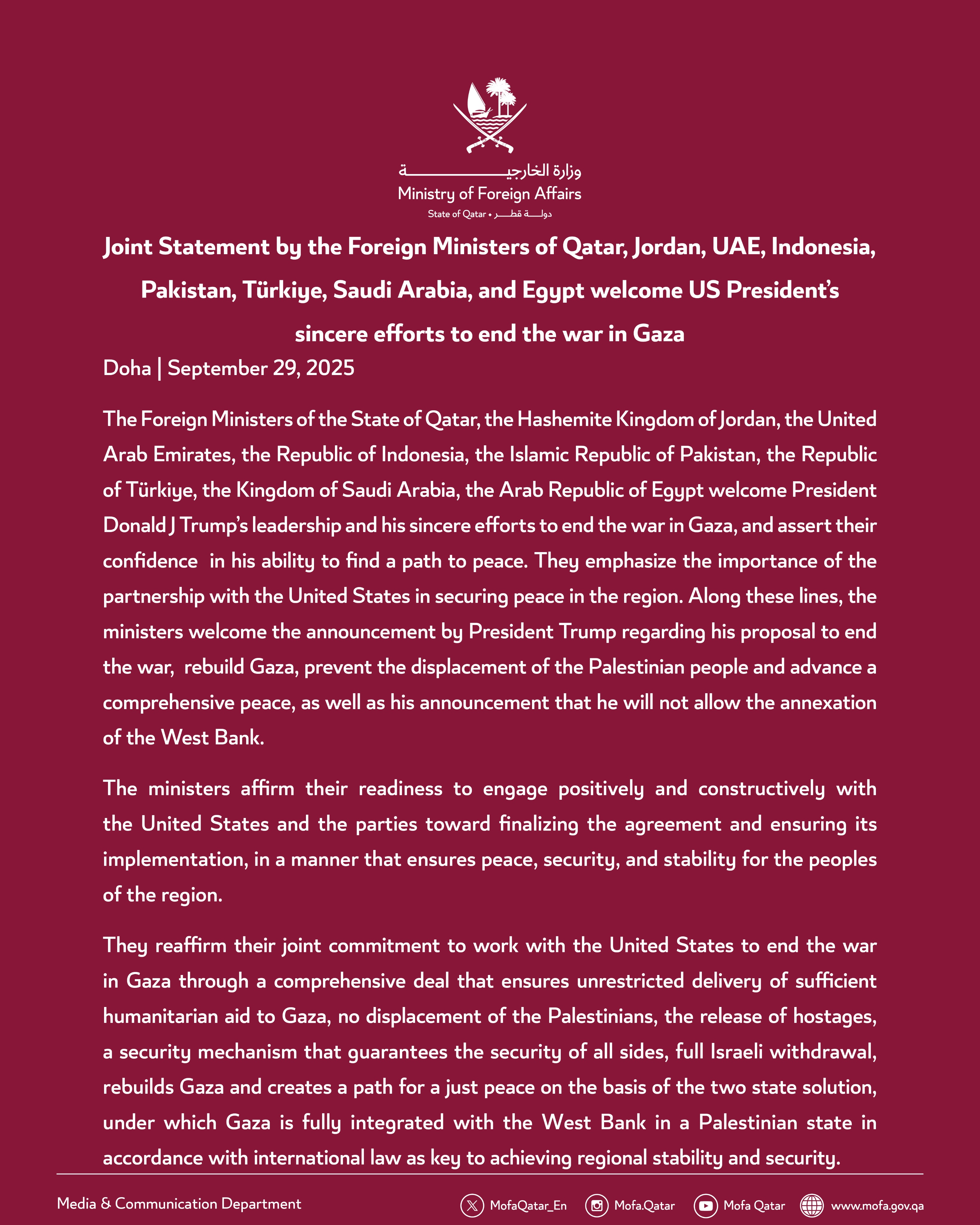Hujjatda AQSh prezidenti tomonidan taqdim etilgan G‘azo urushini to‘xtatish, mintaqani tiklash va falastinliklarning majburan ko‘chirilishining oldini olishga qaratilgan 20 bandlik rejadan mamnuniyat bildirilgan.