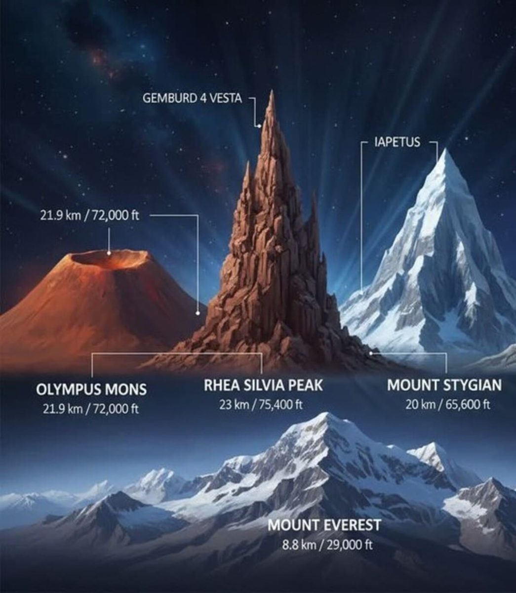 Everestga chiqish, albatta, ta’sirli bo‘lsa-da, Yerdagi eng baland tog‘ aslida Quyosh tizimining cho‘qqilari oldida juda kichik bo‘lib ko‘rinadi.