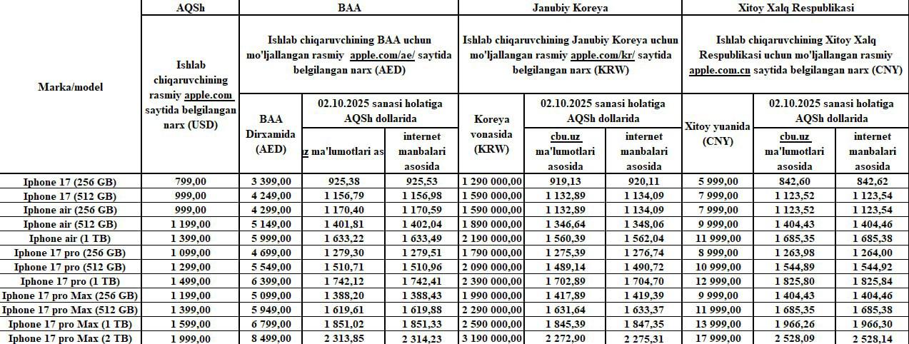 Bojxona qo‘mitasi AQSh, BAA, Janubiy Koreya va Xitoydan olib kiriladigan iPhone 17 smartfonlari narxlari haqida ma’lumot berdi