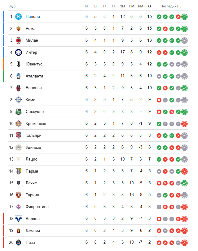 O‘tgan hafta o‘rtasida Yevropa ligasida yutqazib qo‘ygan «Roma» ichki chempionatda g‘alabali yurishini davom ettirib, Florensiyadan ham uch ochko bilan qaytdi. Bu «bo‘rilar» o‘z tarixida uchinchi marta chempionat startidagi dastlabki uchta safar o‘yinida g‘alaba qozonishi bo‘lmoqda. Yakshanba kungi g‘alaba ijodkori Soule bo‘ldi, «Lill» bilan o‘yinda penaltini aniq ijro eta olmagan futbolchi aybini to‘liq yuvdi. Argentinalik hujumkor yarimhimoyachi avvaliga navbatdagi marta jarima maydoni tashqarisidan yo‘llagan zarbasi (A Seriyada bu borada uning tengi yo‘q) bilan hisobni tenglashtirdi. Keyin esa uning ijrosidagi kornerdan keyin Kristante bosh bilan darvozani ishg‘ol etib, g‘alabani ta’minladi. «Fiorentina» Stefano Pioli qo‘li ostida mavsum startida muvaffaqiyatsizlikka uchragan bo‘lsa (jamoa 6 turda 3 durang va 3 mag‘lubiyat qayd etgan), Jan Piyero Gasperini boshchiligida rimliklar 6 turda 5 g‘alabaga erishdi va onlayn rejimda turnir jadvalining birinchi o‘rniga chiqib olishdi.